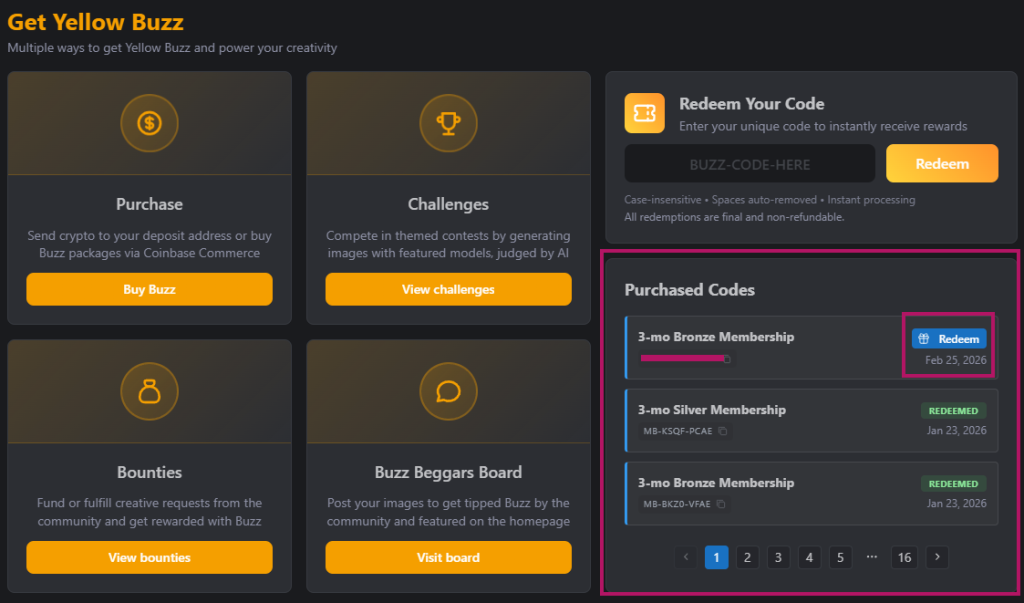 Once your transaction has settled – and this can take quite some time depending on the type of crypto you paid with – you will receive an on-site Notification, and your new Gift Code will appear in the Purchased Codes section of the Buzz Dashboard – https://civitai.com/user/buzz-dashboard