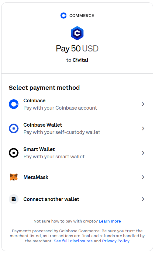 You’ll be directed to the Coinbase Commerce wizard.