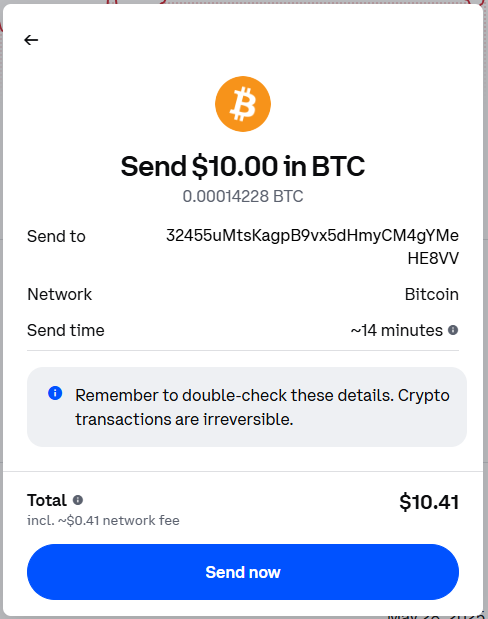 We’re going to send $10 USD worth of Bitcoin, from Coinbase.com, to our Civitai BTC address. How this is accomplished varies by app – but there will most likely be a “Send crypto” option.