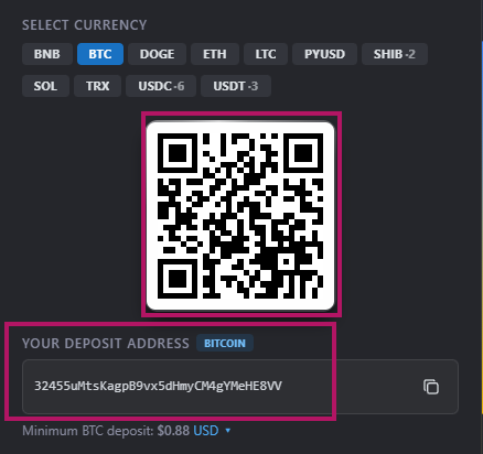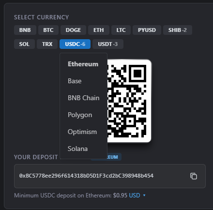 You’ll be presented with a QR code, and a number of Currencies.