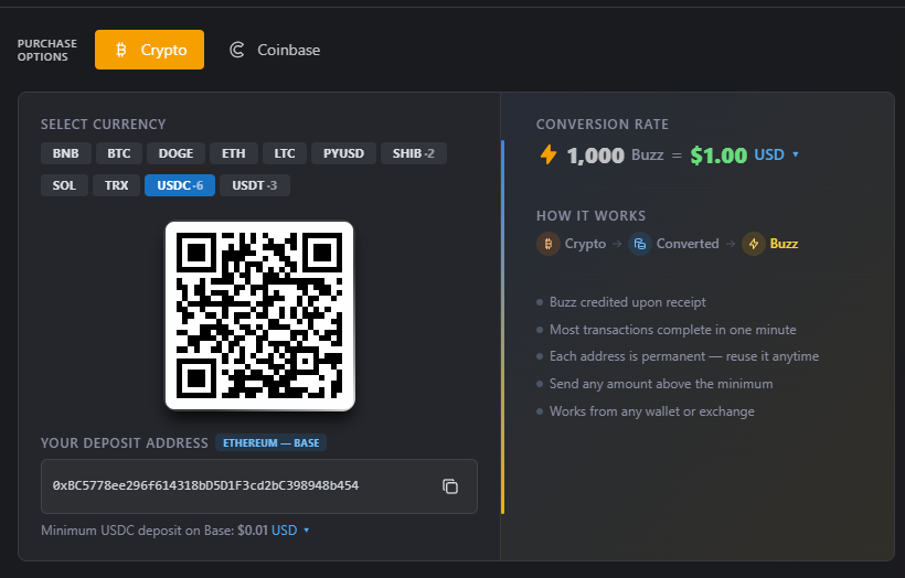 A: Usually within a few minutes, depending on coin choice and network congestion. If you’re using USDC Base and don’t see your Buzz after 1 hour, contact support. Other coins and networks may take longer to process.