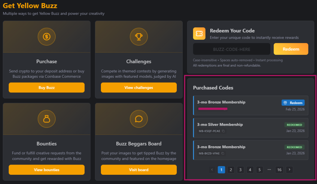 Once your payment transaction has settled, your new Membership code will appear in the Buzz Dashboard (https://civitai.com/user/buzz-dashboard).